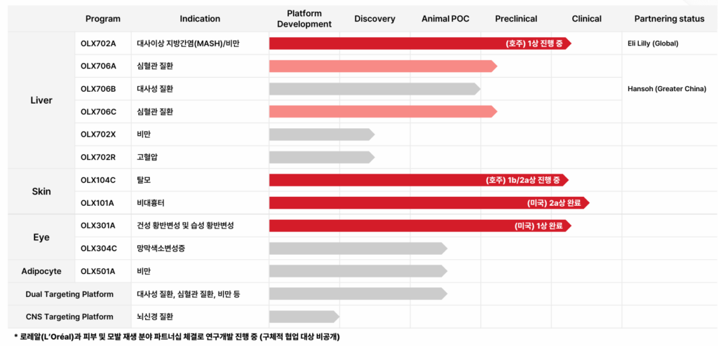 siRNA 기반 RNA 치료제 기업 올릭스가 간질환(MASH) 치료제 임상 결과 발표를 앞두고 관심을 받고 있다. 올릭스는 siRNA 플랫폼 기술을 바탕으로 간질환뿐 아니라 비만, 탈모 등 다양한 적응증으로 파이프라인을 확장하고 있다.