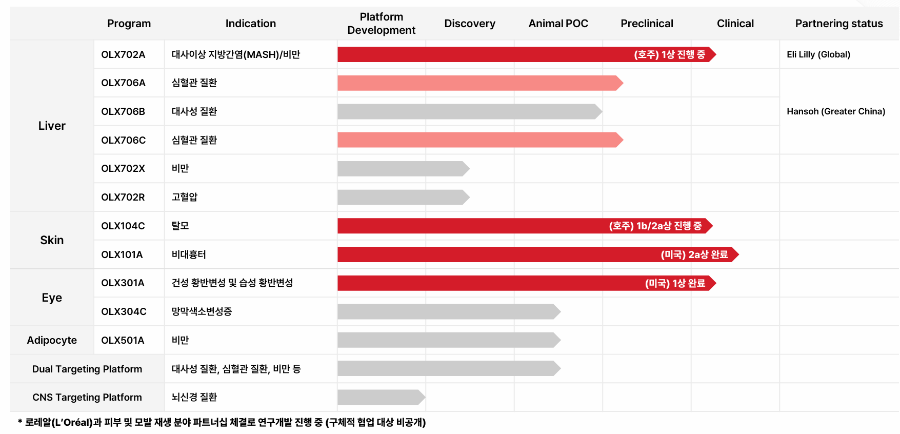 탈모 치료제 ‘OLX104C’는 프랑스 로레알(L’Oréal)과의 피부·모발 분야 공동 연구 계약을 기반으로 개발 중이다. 올릭스는 OLX104C에서 임상 1a상 안전성을 확인한 뒤 현재 임상 1b/2a상을 진행하고 있다. 계약 금액은 상대방 요청에 따라 공시가 유보됐고, 2025년 12월 마일스톤을 수령한 것으로 알려졌다.